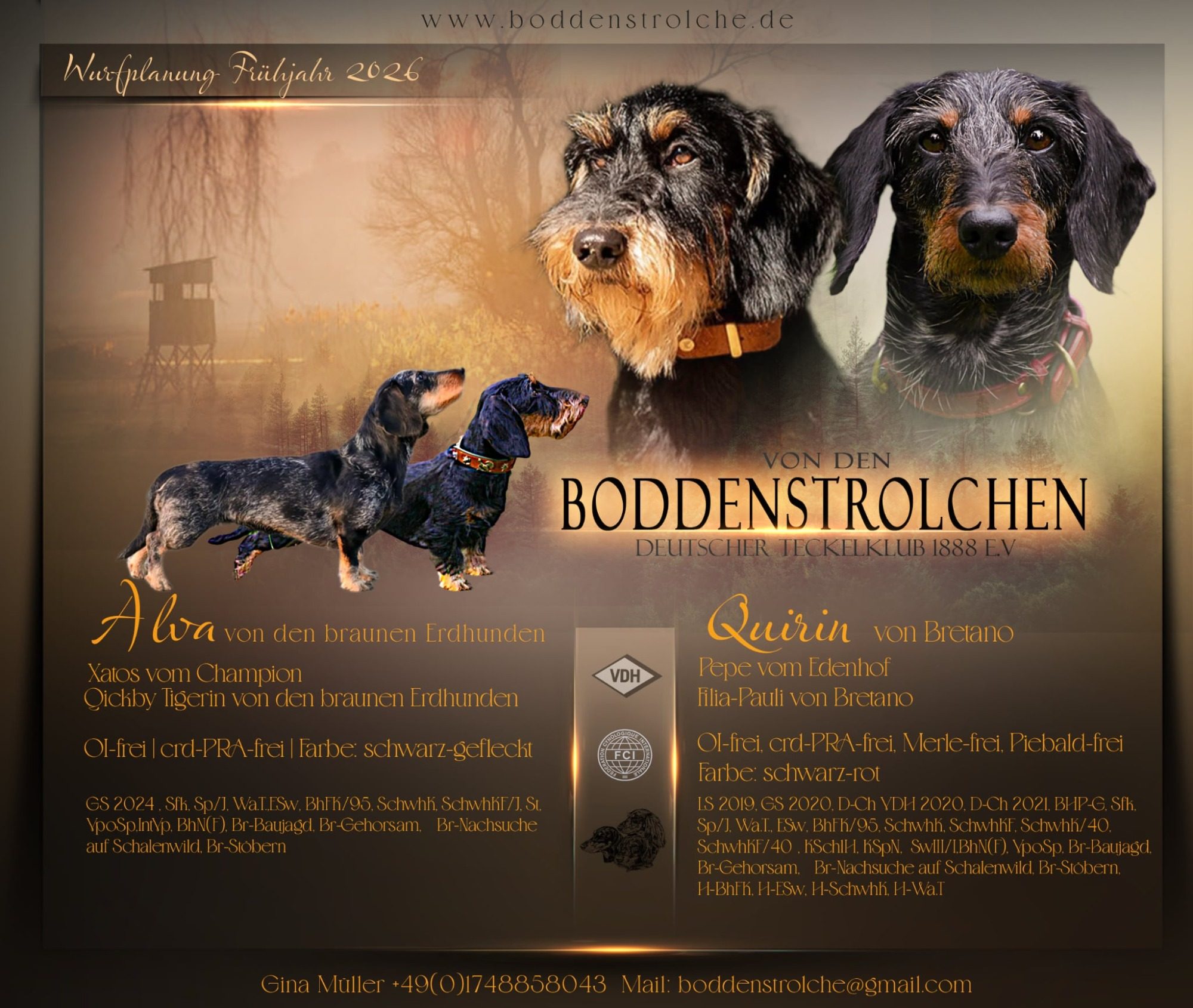 Quirin ist bereits Vater von vielen leistungsstarken und führerbezogenen Rauhaarteckeln. Er überzeugt mit seinem herzlichen und charmanten Charakter, ist im Alltag ein unkomplizierter Begleiter und im praktischen Jagdbetrieb kompromisslos am Wild. Der schwarz-rote Rüde ist nicht nur wunderschön (und kerngesund!), sondern charakterlich auch einwandfrei sowie jagdlich eine Granate.